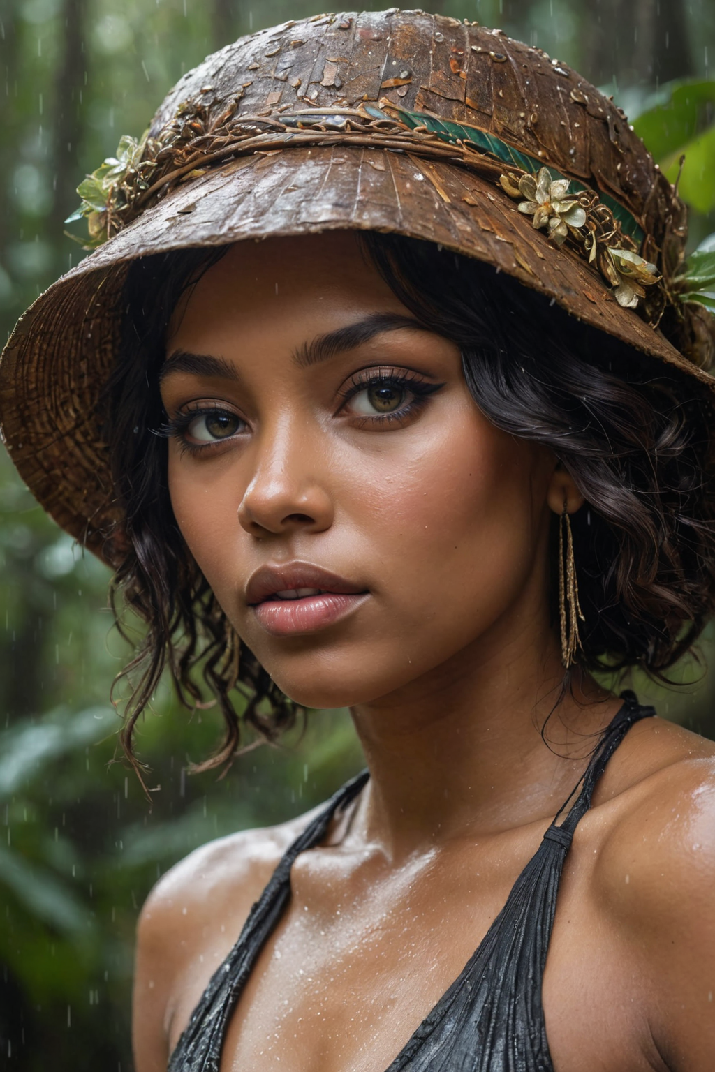 An ethereal character, medium oval eyes, rainforest, immaculate composition, tim okamura, brian viveros, rain falling, eyes closed, dynamic light and shadow, bold high quality, digital art,realistic skin